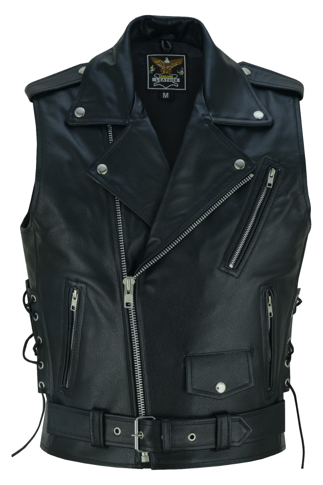 - These Leather Motorcycle Vests are made from heavy 1.1mm – 1.2mm naked Cowhide Leather. Top Grain premium Leather ensures the garment’s long durability.